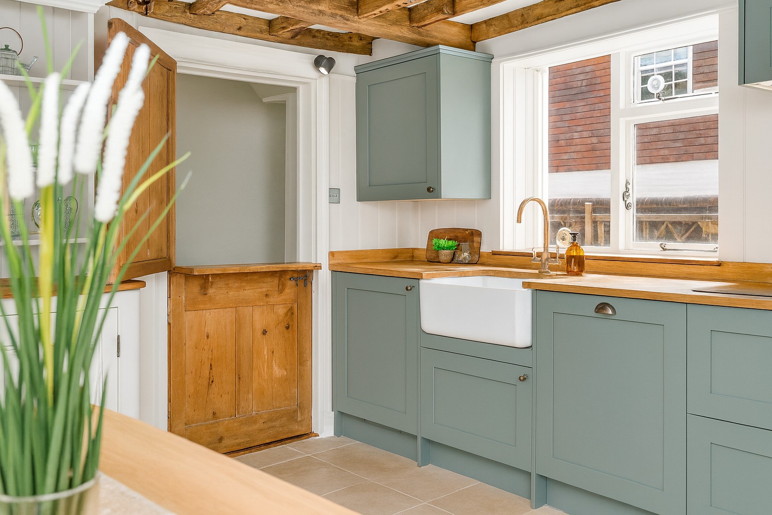 • Farmhouse-style kitchen with sage cabinetry and natural wood worktops.